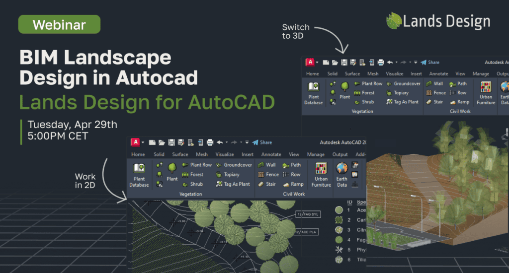 Nehmen Sie an unserem nächsten Webinar teil und erfahren Sie, wie Lands Design Ihnen hilft, Ihre AutoCAD-Umgebung in eine leistungsstarke Lösung für professionelles Landschaftsdesign umzuwandeln, die 3D-Modellierung, Pflanzdesign, Geländewerkzeuge und erweiterte BIM-Funktionen kombiniert.
