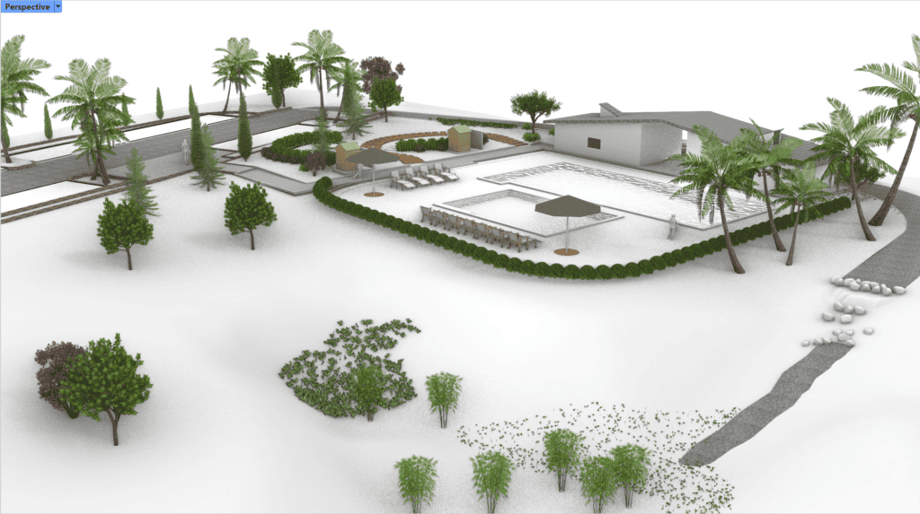 En pruebas recientes se ha explorado la integración de Rhino Banana, un plugin de renderizado para Rhino basado en IA, con un modelo de paisaje desarrollado en RhinoLands. Los resultados demuestran cómo la visualización basada en IA puede combinarse eficazmente con los flujos de trabajo paisajísticos orientados al BIM.