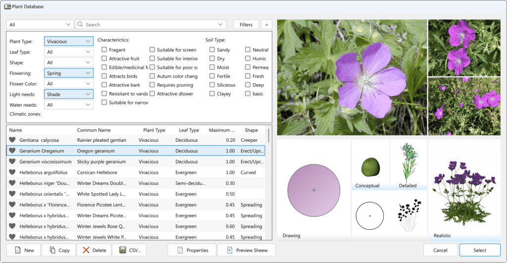 Good planting design is not only aesthetic. It is also technical and ecological. The best landscape design software helps designers select species based on criteria such as climate, soil type, water requirements, maintenance level, and botanical characteristics.