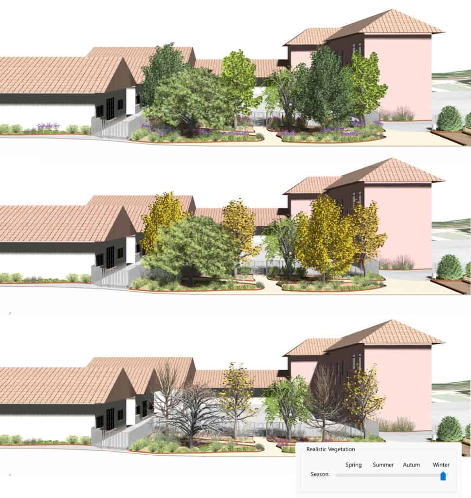 Seasonal simulation helps landscape architects present a project more realistically. A tree in spring does not offer the same visual density as it does in summer. Autumn color can transform the character of a public space. Winter reveals structure, openness, and visibility in very different ways. These changes matter in schools, parks, streetscapes, and residential projects, where people experience the landscape throughout the year.