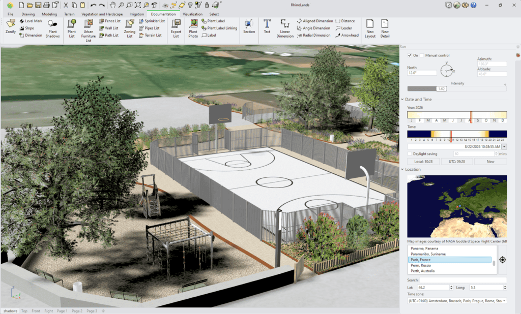 Working with geolocated site data inside the same landscape design software helps designers make better early decisions. Real coordinates and solar position can be used to study sun exposure and shadow behavior throughout the year. This is especially useful in public projects where comfort matters.